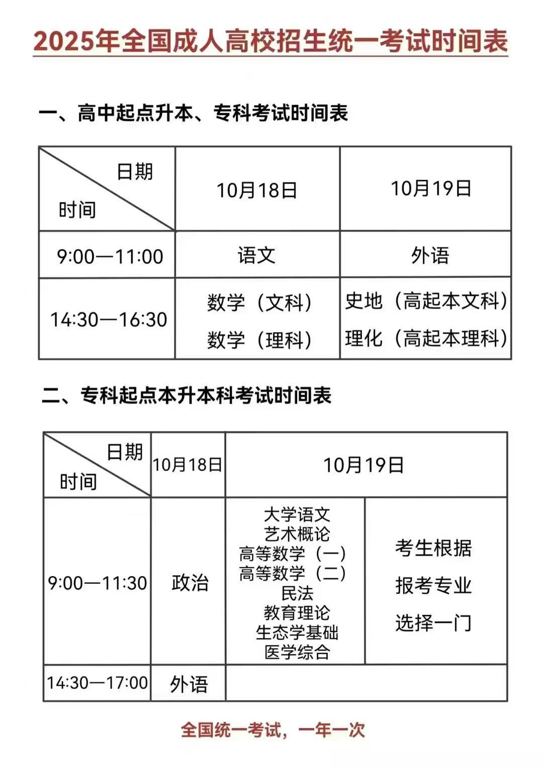 10月19日:上午9:00-11:00 外语 下午14:30-16:30 史地综合(高起本文科)/物化综合(高起本理科)