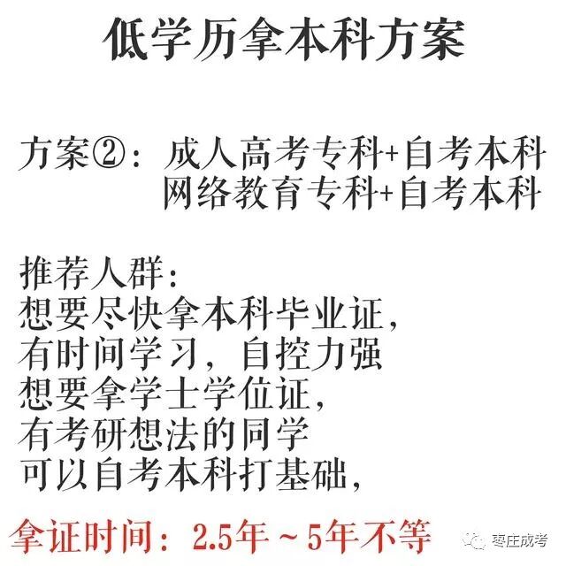 六、个人推荐方案② 时间少 含金量高。自考本科申请毕业前,你的成考专科或者网络教育专科已经拿出证书来即可。